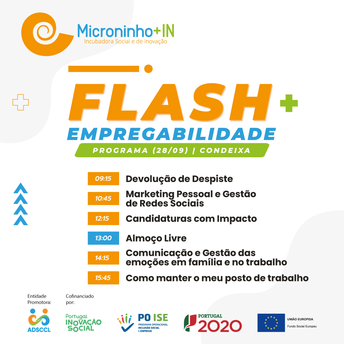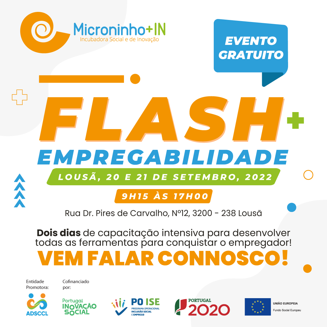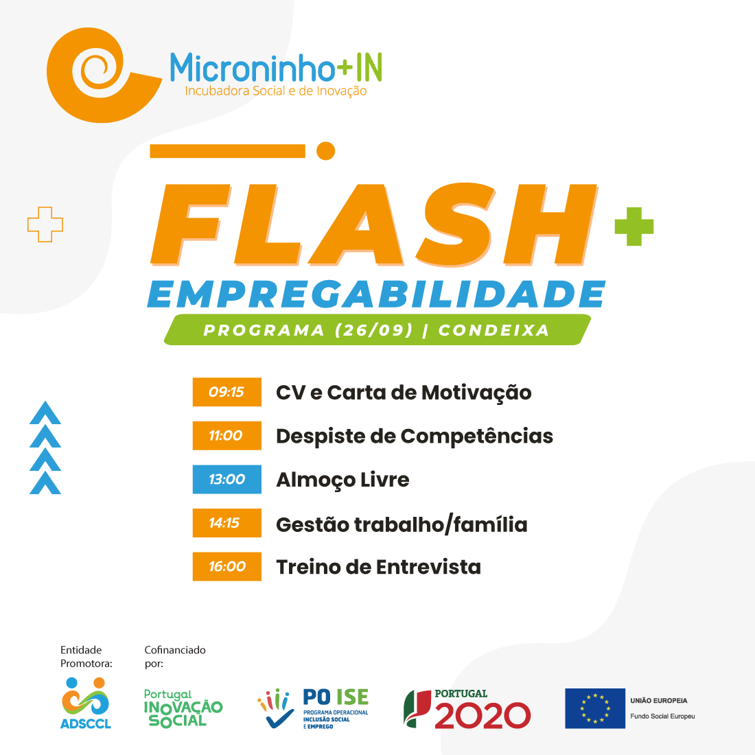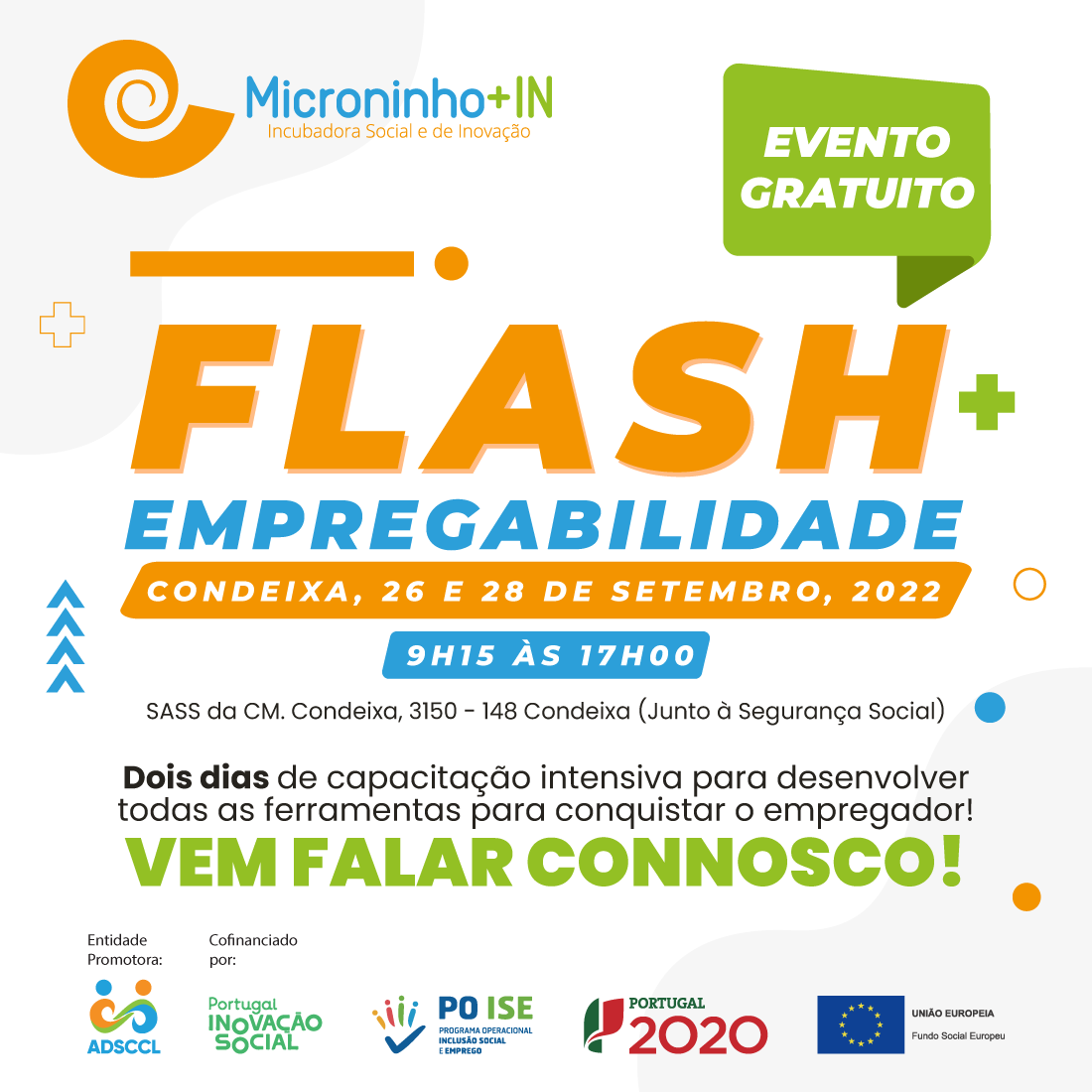 O Microninho+IN - Incubadora Social está promover um Flash de Empregabilidade nos dias 20 e 21 de Setembro (Lousã) e 26 e 28 de Setembro (Condeixa), oferecendo, dois dias (por concelho) de capacitação intensiva para desenvolver todas as ferramentas para conquistar o empregador.