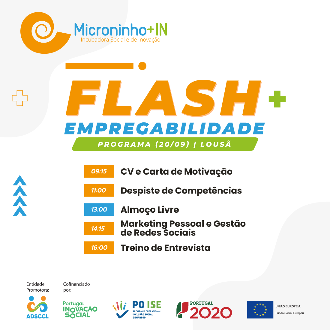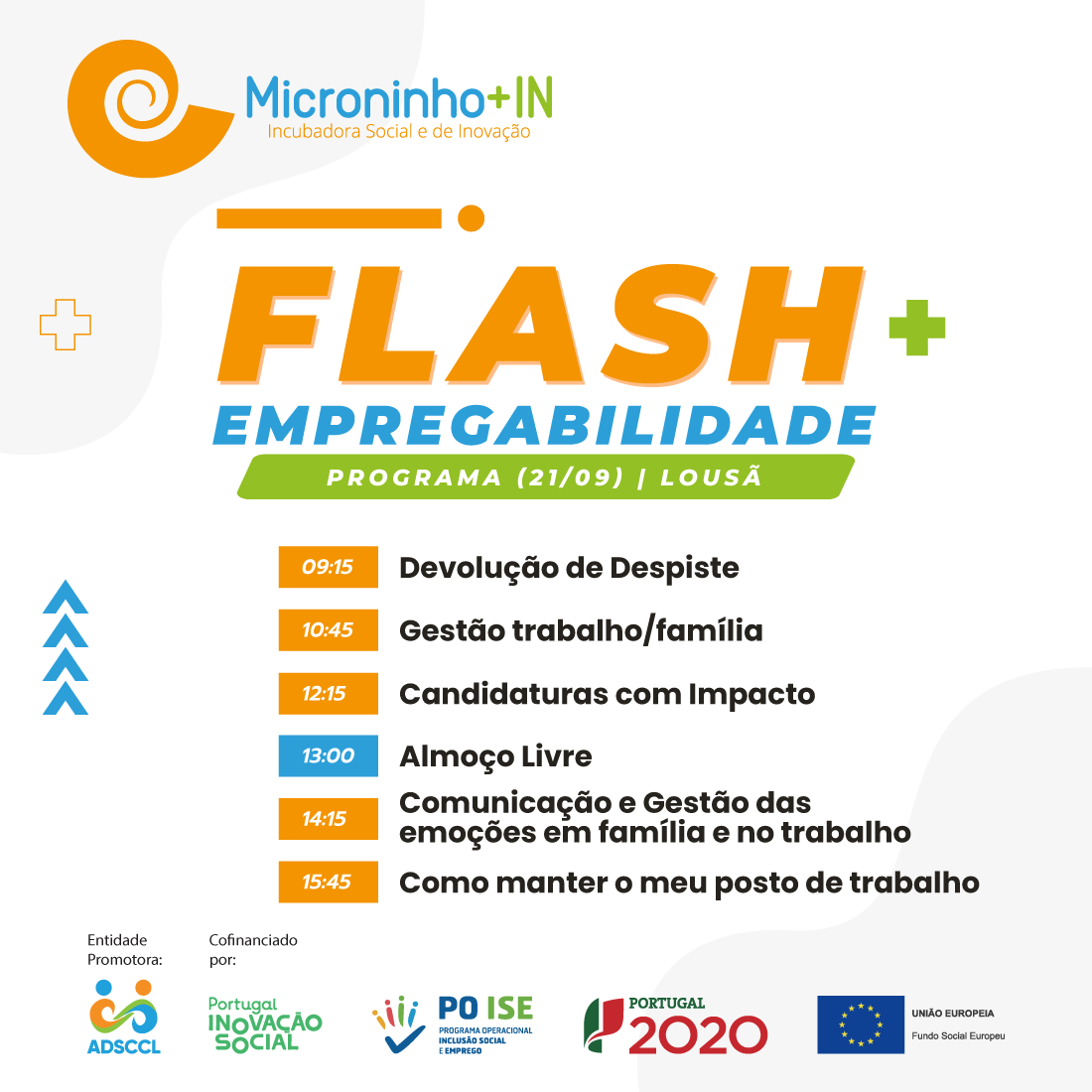 O Microninho+IN - Incubadora Social, encontra-se a promover um Flash de Empregabilidade nos dias 20 e 21 de Setembro (Lousã) e 26 e 28 de Setembro (Condeixa).