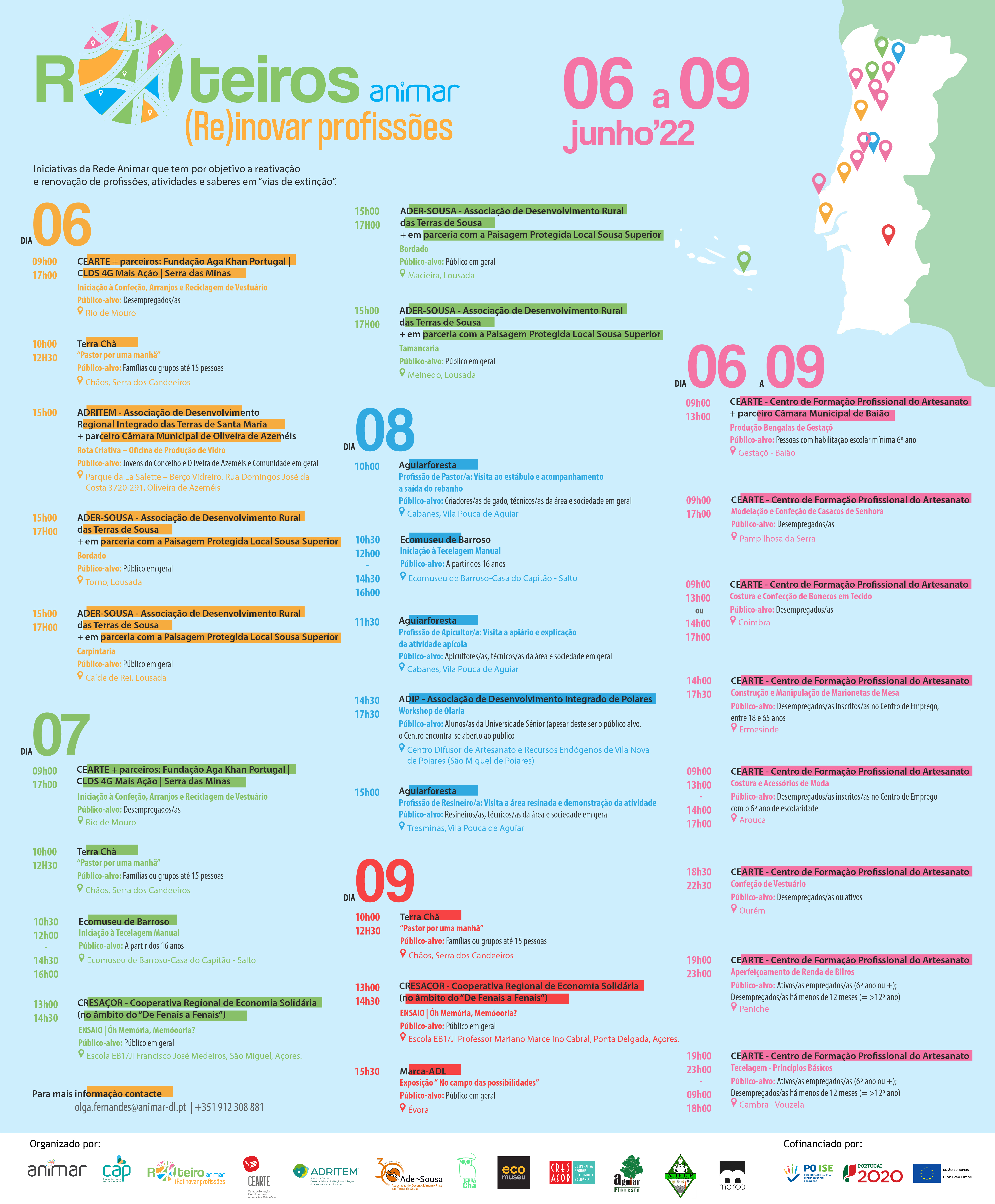 Para mais informações e manifestação de interesse em integrar o ROTEIRO ANIMAR (Re)inovar profissões (até ao dia 25 maio): olga.fernandes@animar-dl.pt e jessica.soares@animar-dl.pt | 210938173 ou 912308881