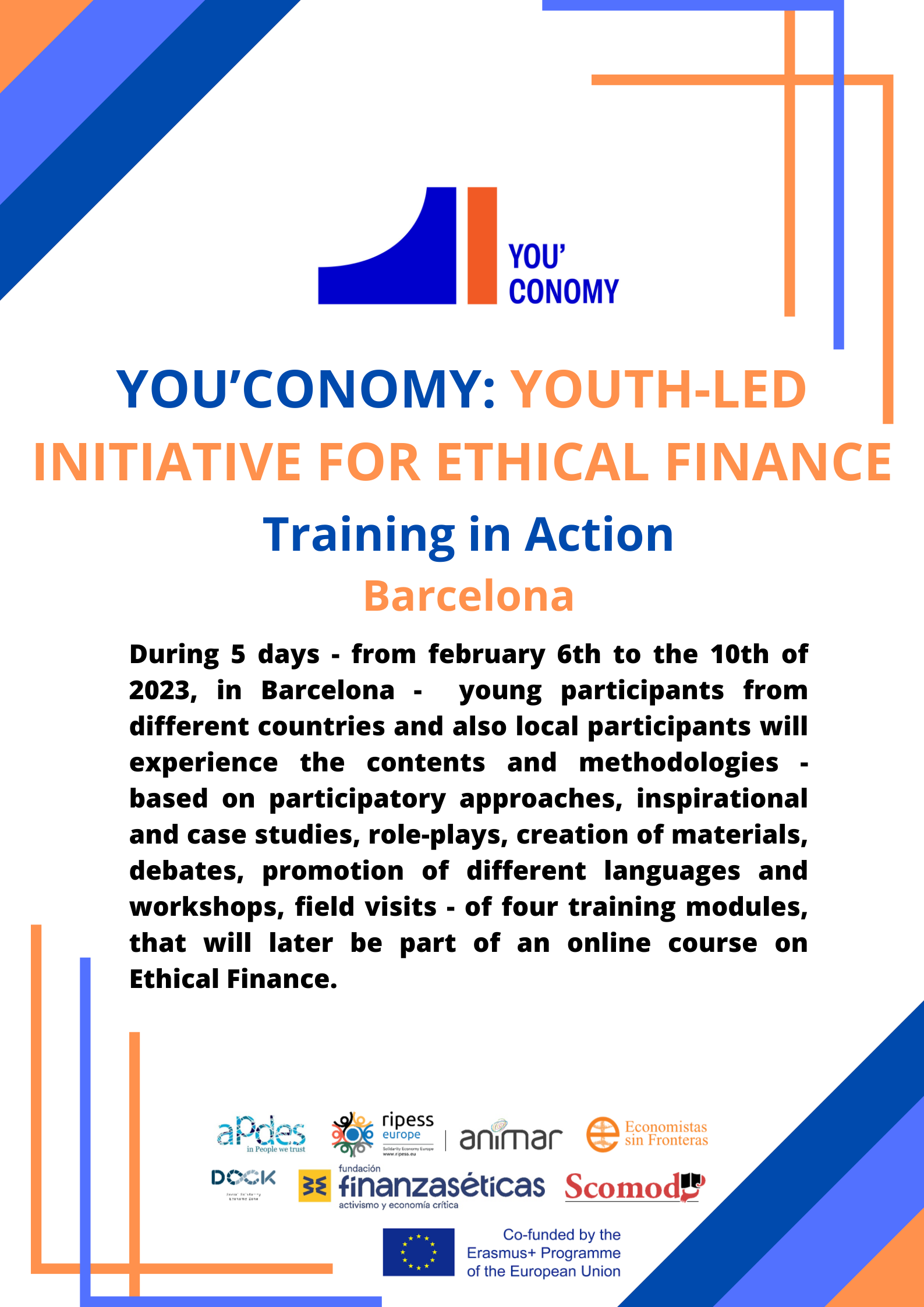 No âmbito do programa Eramus +, financiado pela Comissão Europeia, o projeto “YOU'conomy: A youth-led initiative for Ethical FinanceDurante” vai dinamizar durante 5 dias - de 6 a 10 de fevereiro de 2023, em Barcelona – com jovens participantes locais e internacionais (provenientes dos países da parceria: Portugal, Espanha, Grécia, Luxemburgo e Itália) uma formação internacional com conteúdos e metodologias piloto – tendo por base abordagens participativas, inspiradores e casos, encenações, criação de materiais, debates, promoção de diferentes línguas, workshops e visitas de estudo - de quatro módulos formativos sobre Finanças Éticas, que depois farão parte de um curso online a disponibilizar numa plataforma moodle europeia.