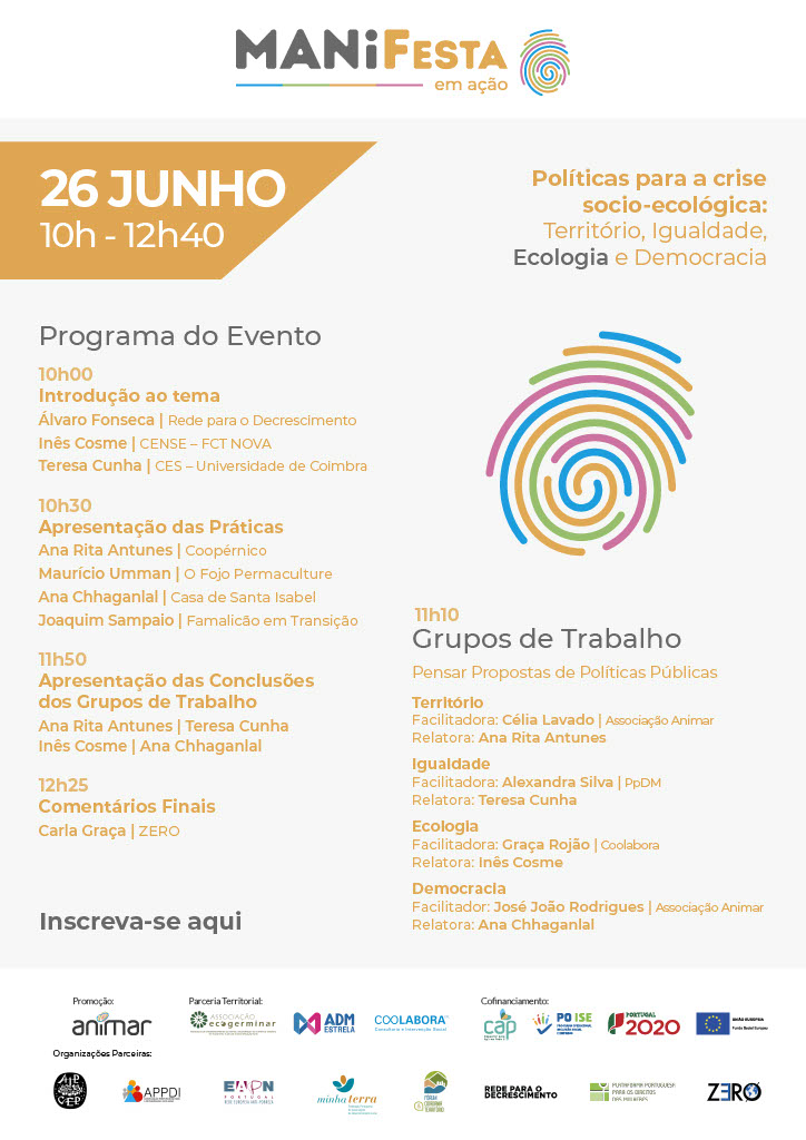 O webinário contará com um momento de debate, em grupos de trabalho online, sobre os temas centrais da manifesta: território, ecologia, igualdade e democracia, tendo em vista recolher propostas para políticas públicas.