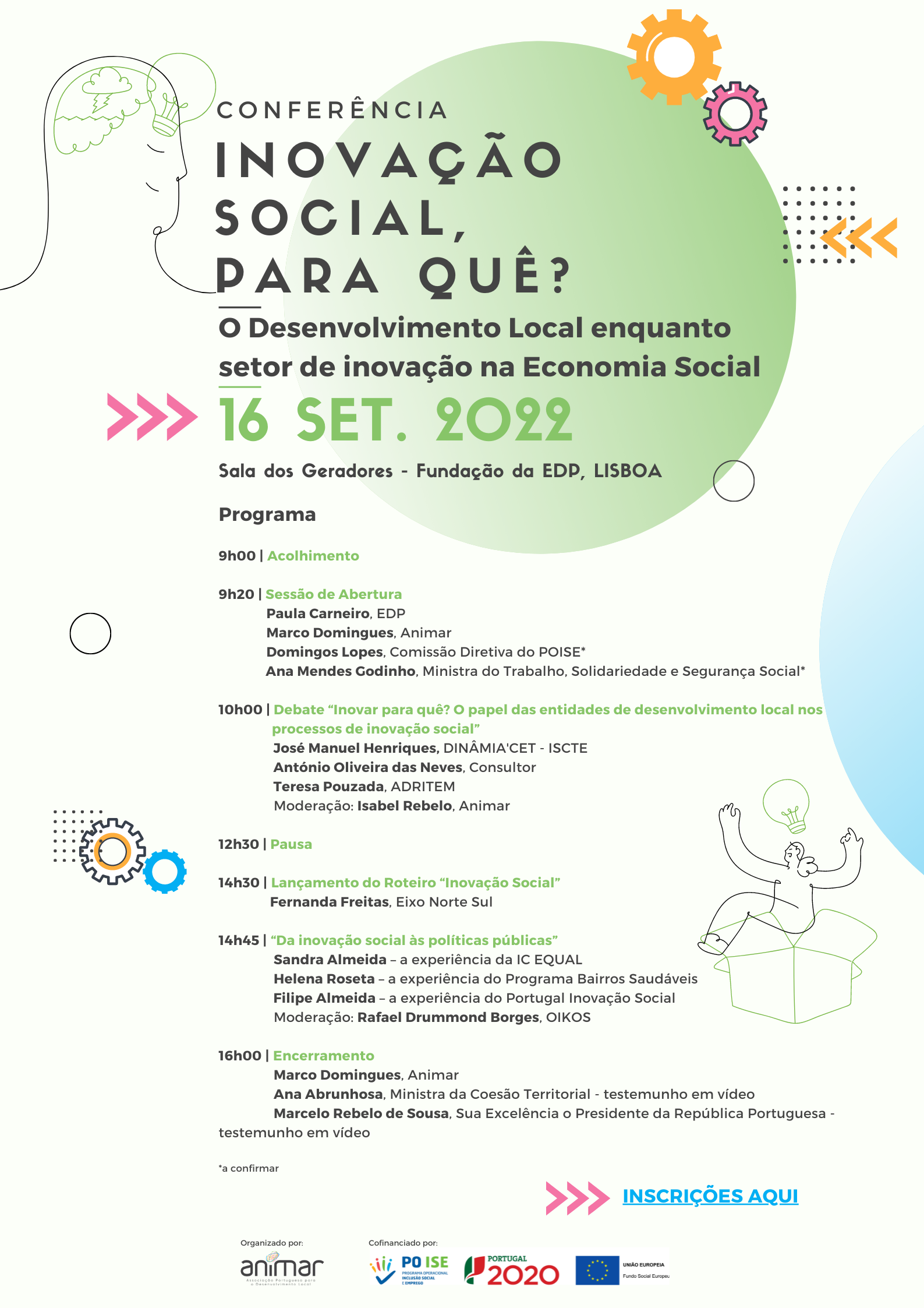 Esta iniciativa, cujo programa está disponível para consulta em anexo, tem como propósito a realização de uma reflexão sobre a temática da inovação social, nomeadamente o contributo de programas que têm vindo a contribuir para as políticas públicas com enfoque nesta temática, bem como o contributo das entidades de desenvolvimento local nos processos de inovação social”.