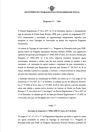 POPH - Alteração ao Regulamento Específico da TI 3.1.1 - Programa de Formação-Acção para PME (Despacho /2010 do MTSS)