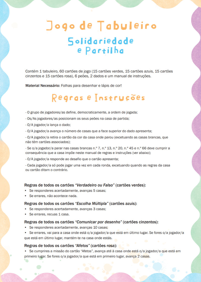 Um jogo de tabuleiro pedagógico que foca de uma forma divertida e criativa a importância dos princípios da solidariedade e partilha, através de vários desafios e questões.